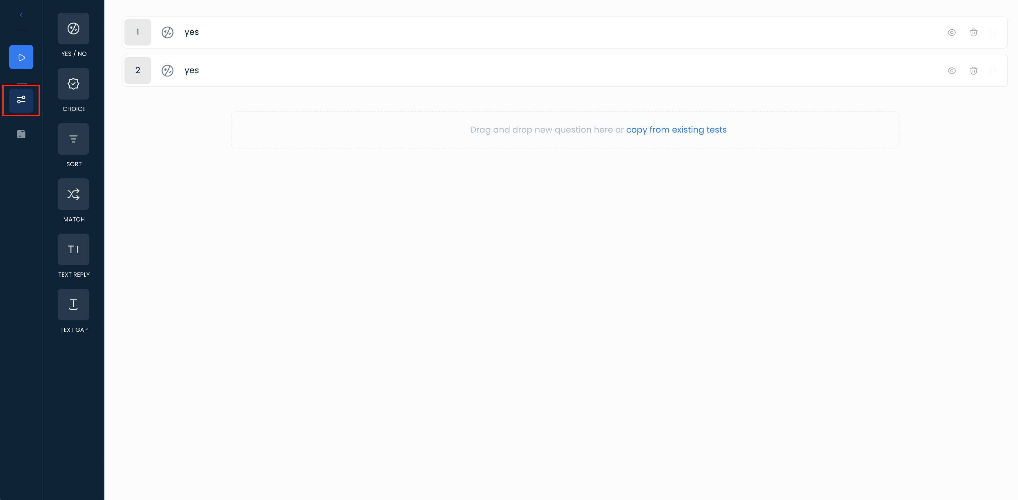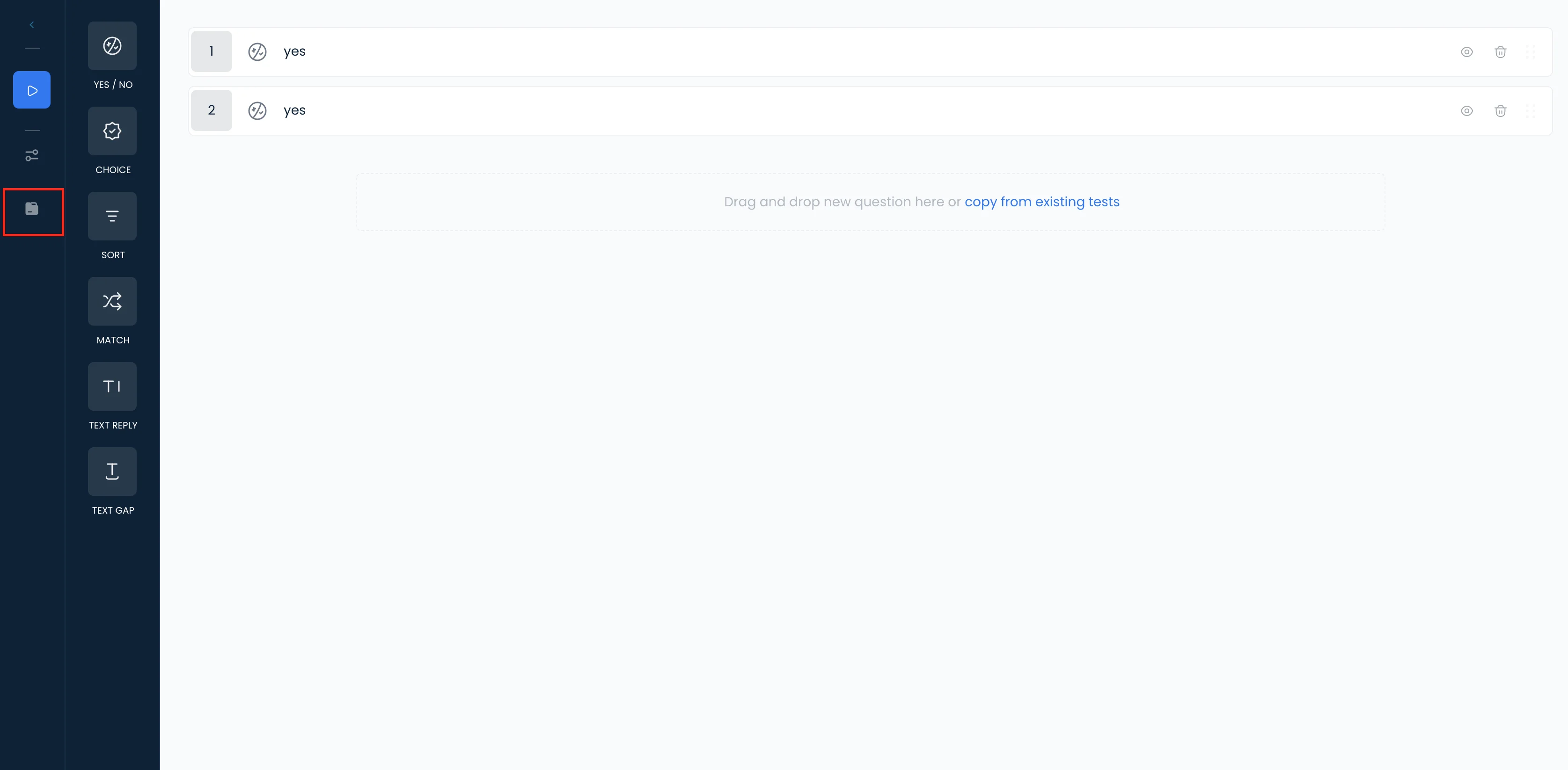 - Click copy from existing tests on the question list panel or the Import icon on the left bar: