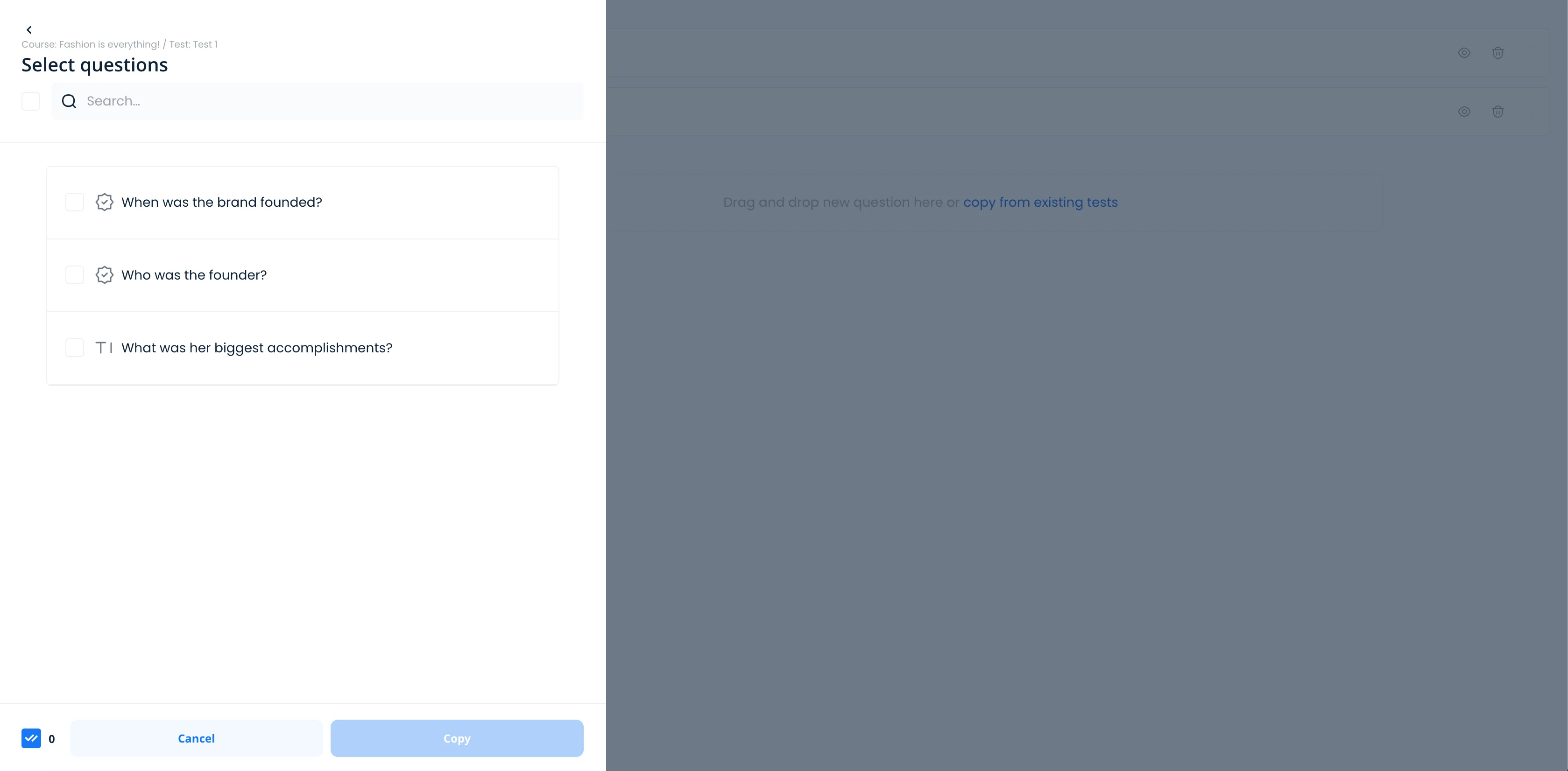 - In the pop-up search for the title of the test that contains questions you want to copy