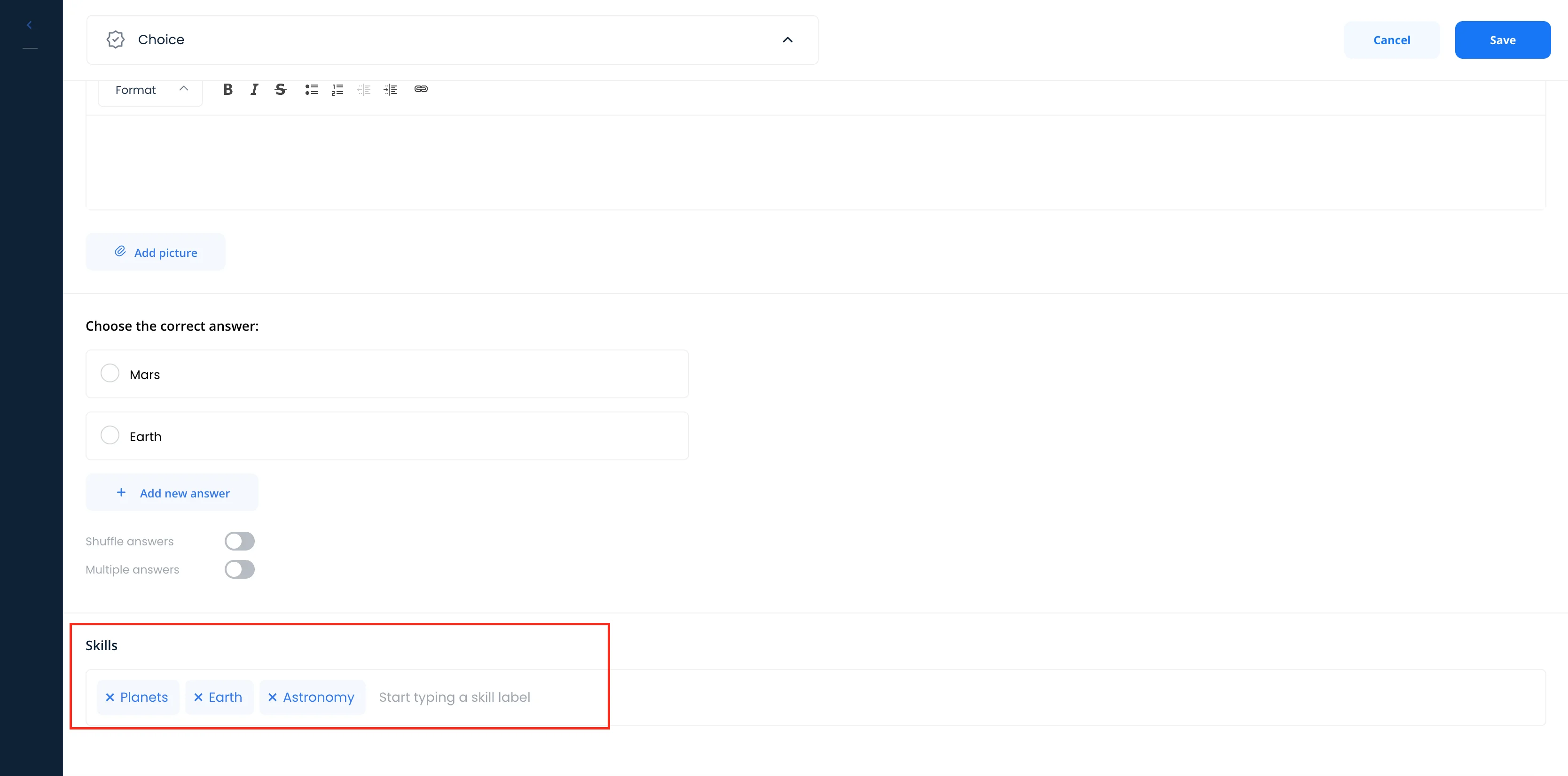 - Forbid skipping questions. By default, learners can skip questions without answering them. Enabling this option will make it so that learners have to answer a question before seeing the next one.