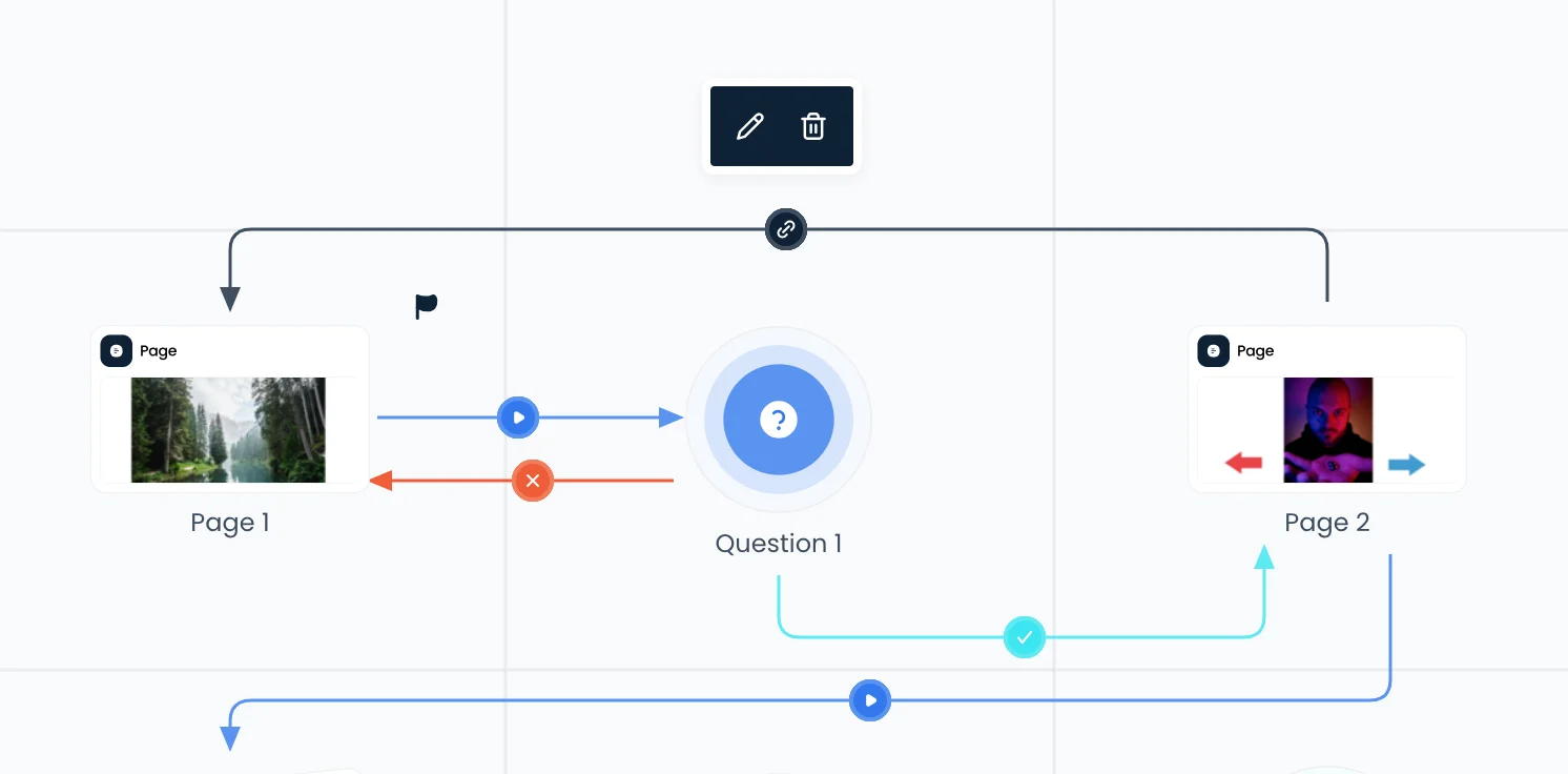 Course map allows you to create "IF" links between the elements to create various paths to walk through the course. You can create menus, pass and fails paths after a test which will lead learners who have completed the test successfully to the congratulations page, and those who failed back to the lesson.