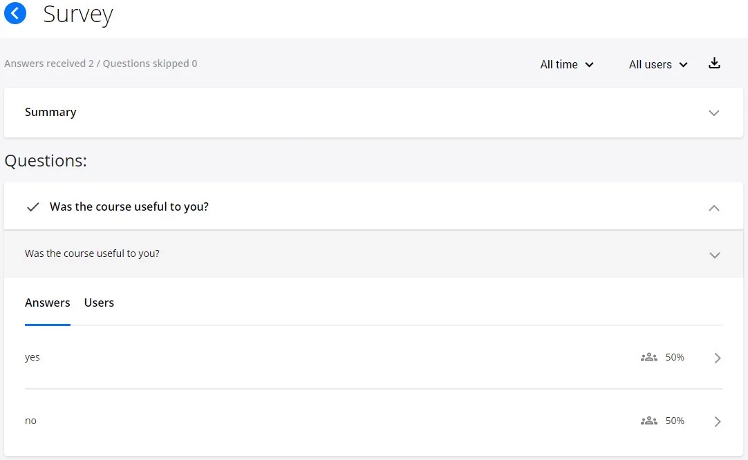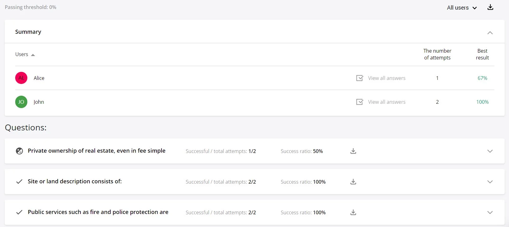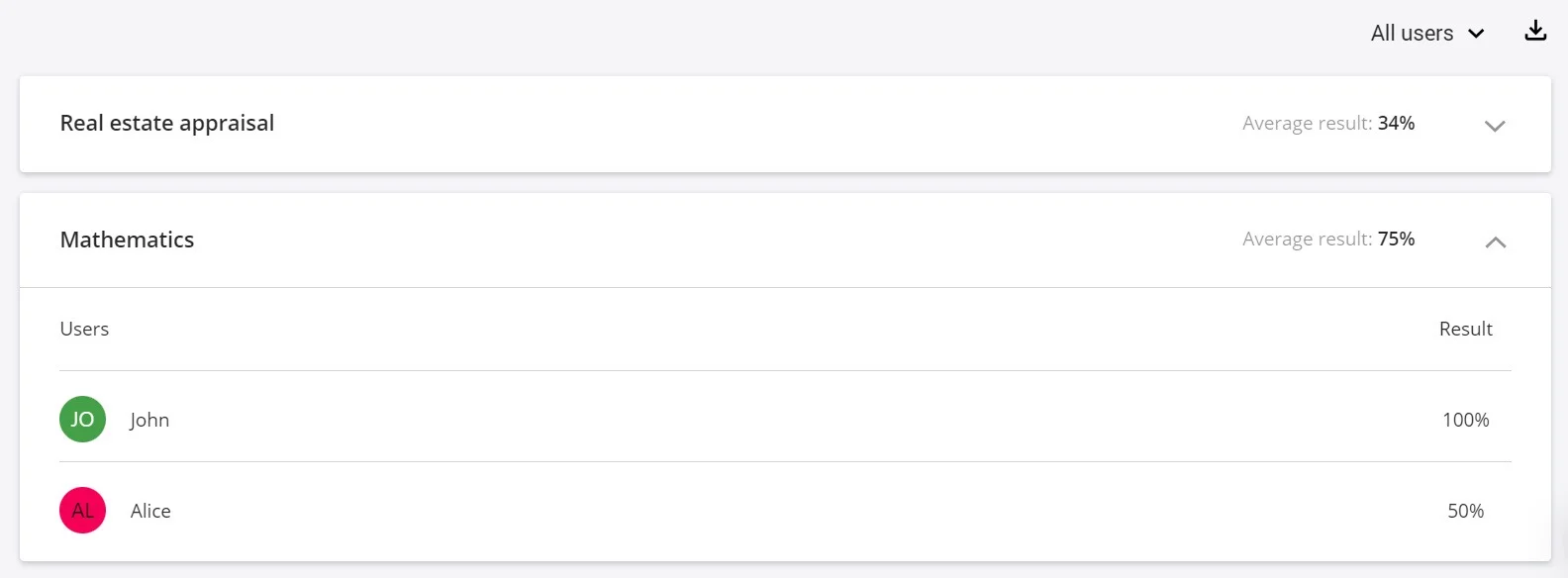 For each test in the course, a separate statistics section is displayed in this field. Click on the course name to access detailed information and the average result for each question or user.