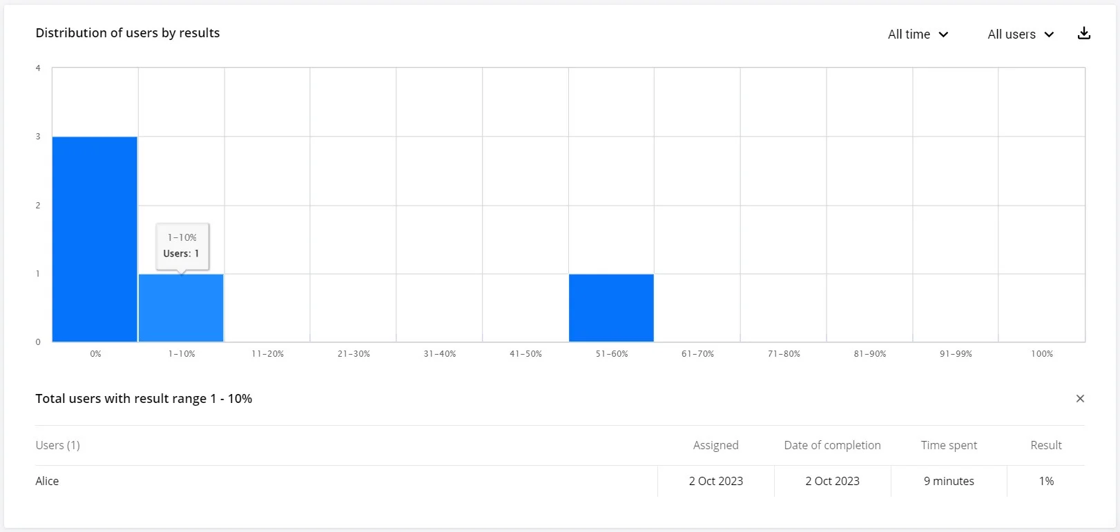 Review information about completed homework assignments for this course. You can sort the data by results, time intervals, or users.