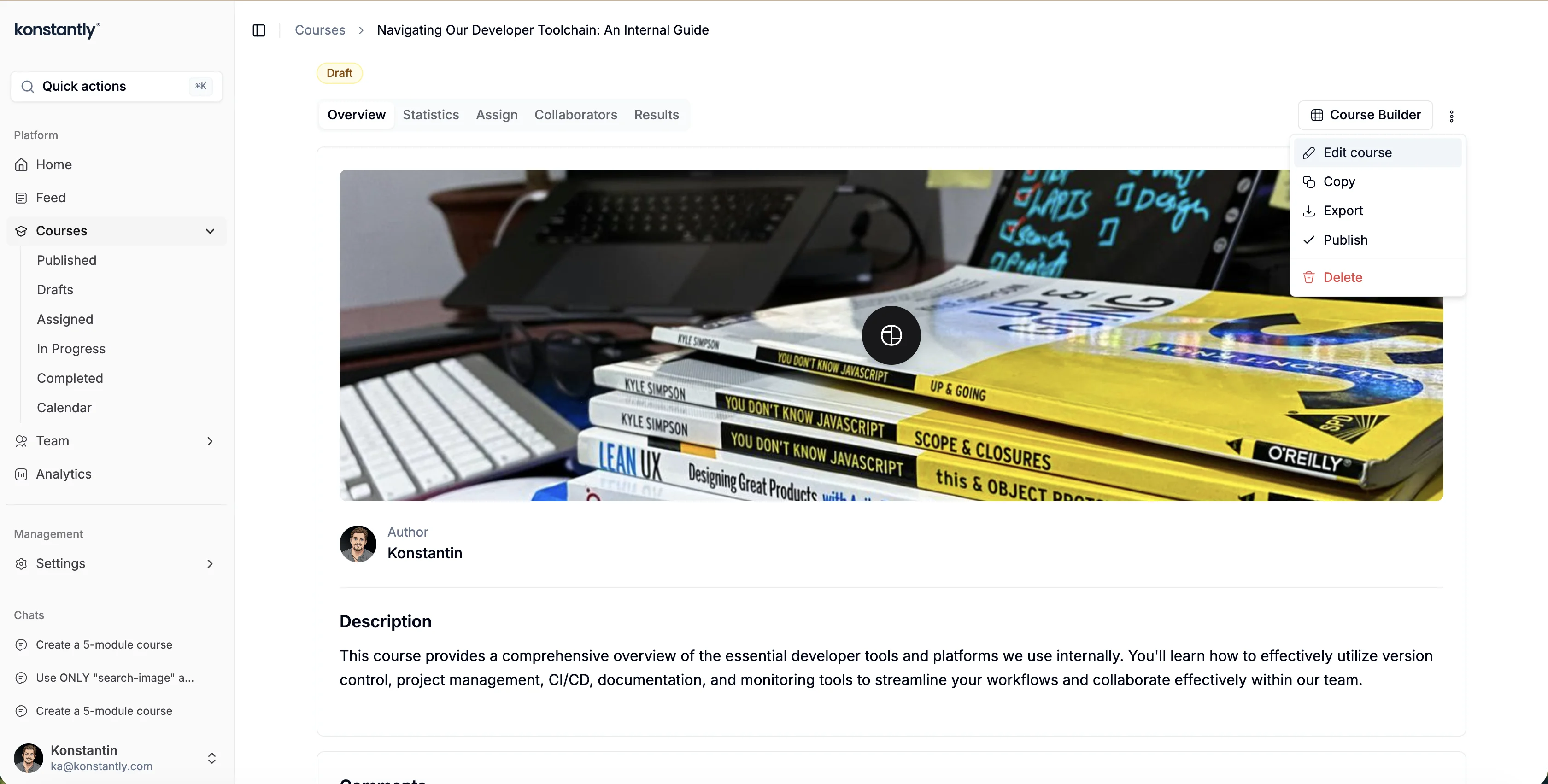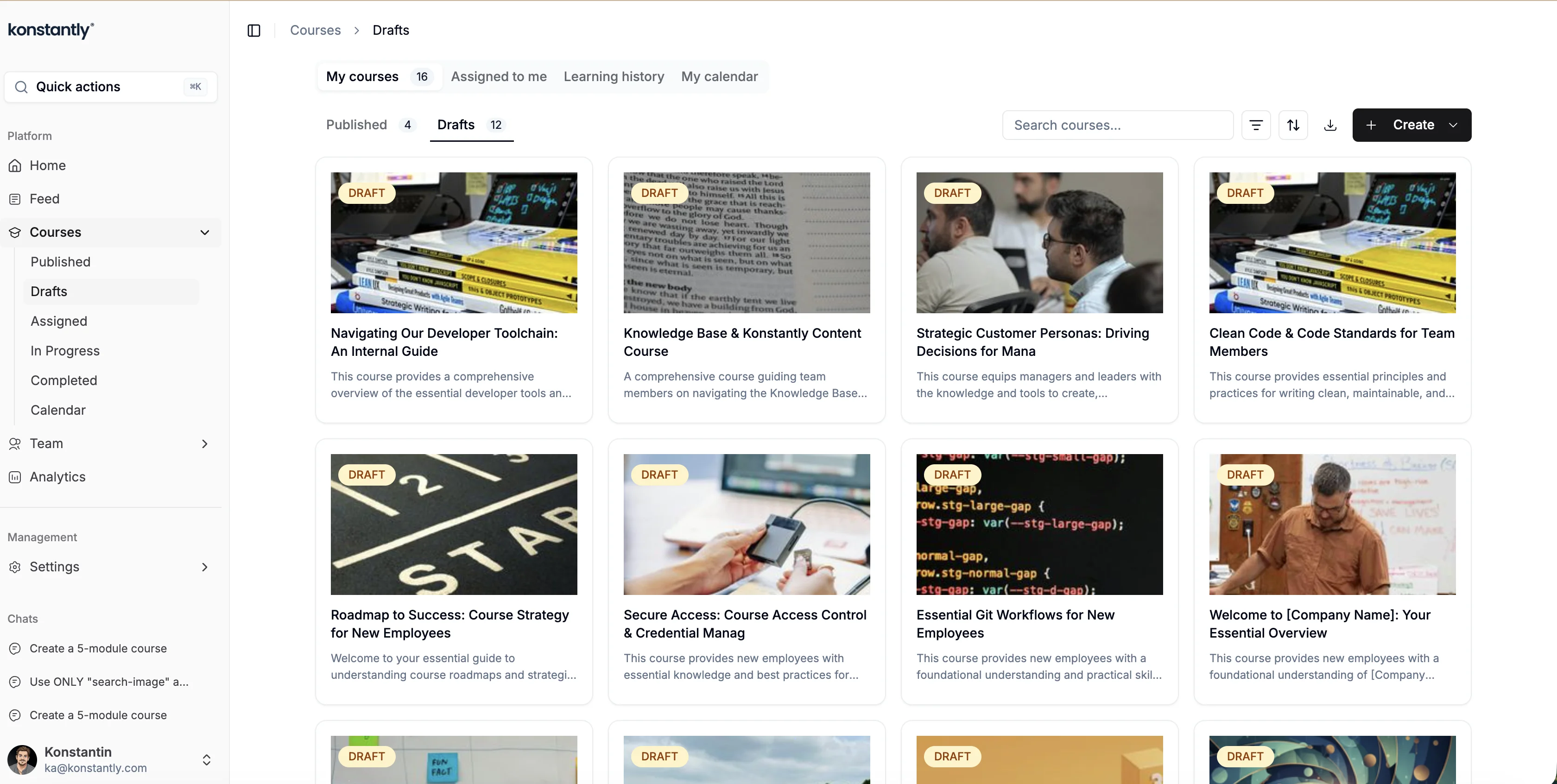 Being an Administrator allows you to see all the courses present on your Konstantly site both 'Published' and 'Drafts'.