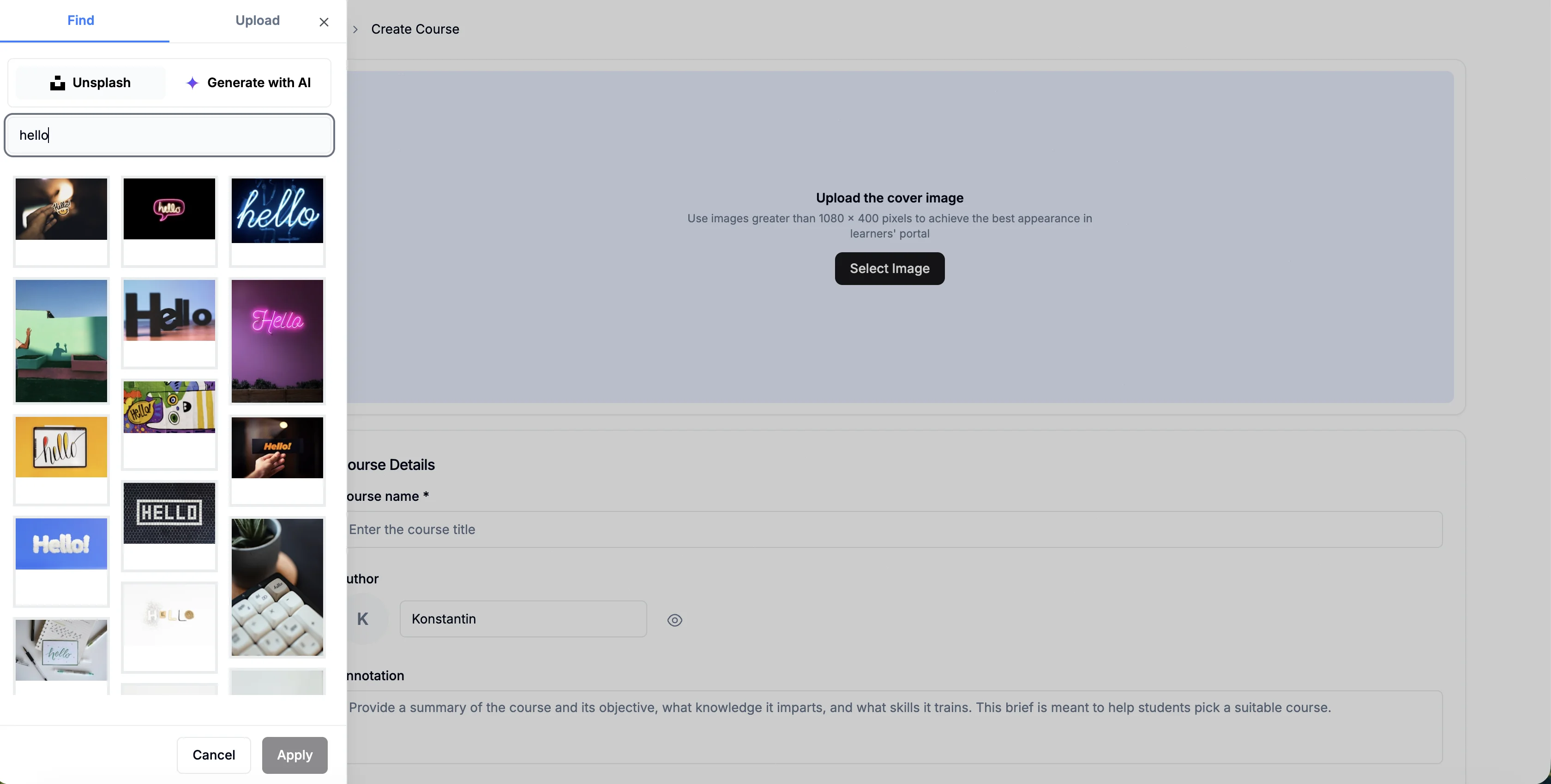 You can search for a cover image from Unsplash or generate one with AI by clicking Select Image.