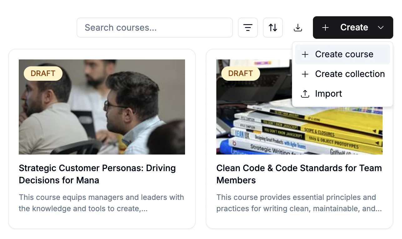 To create a new course open the 'Courses' tab and click '+Create' in the upper right corner. The dropdown menu will ask whether you would like to create or import. Choosing import, be aware that you can upload only previously exported Konstantly courses saved in a zip file.