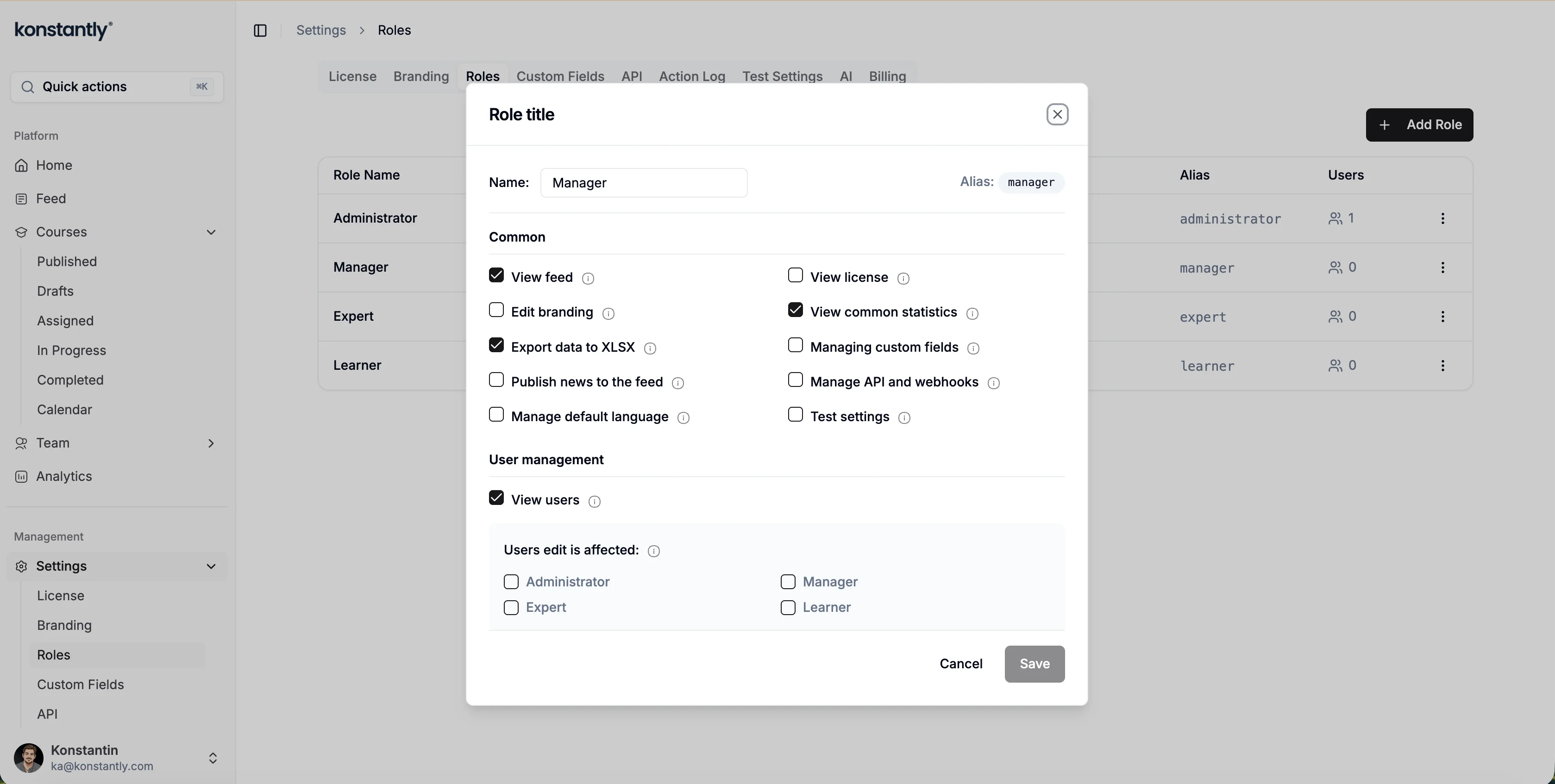 Manage user roles and privileges in Konstantly